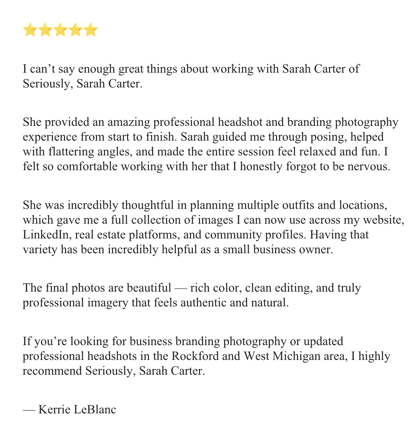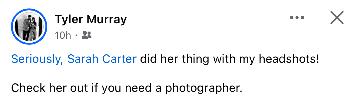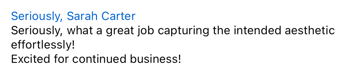 “Thank you so much Sarah! I LOVE the pics! You did an amazing job!”